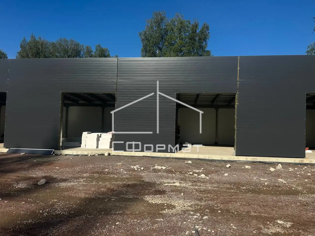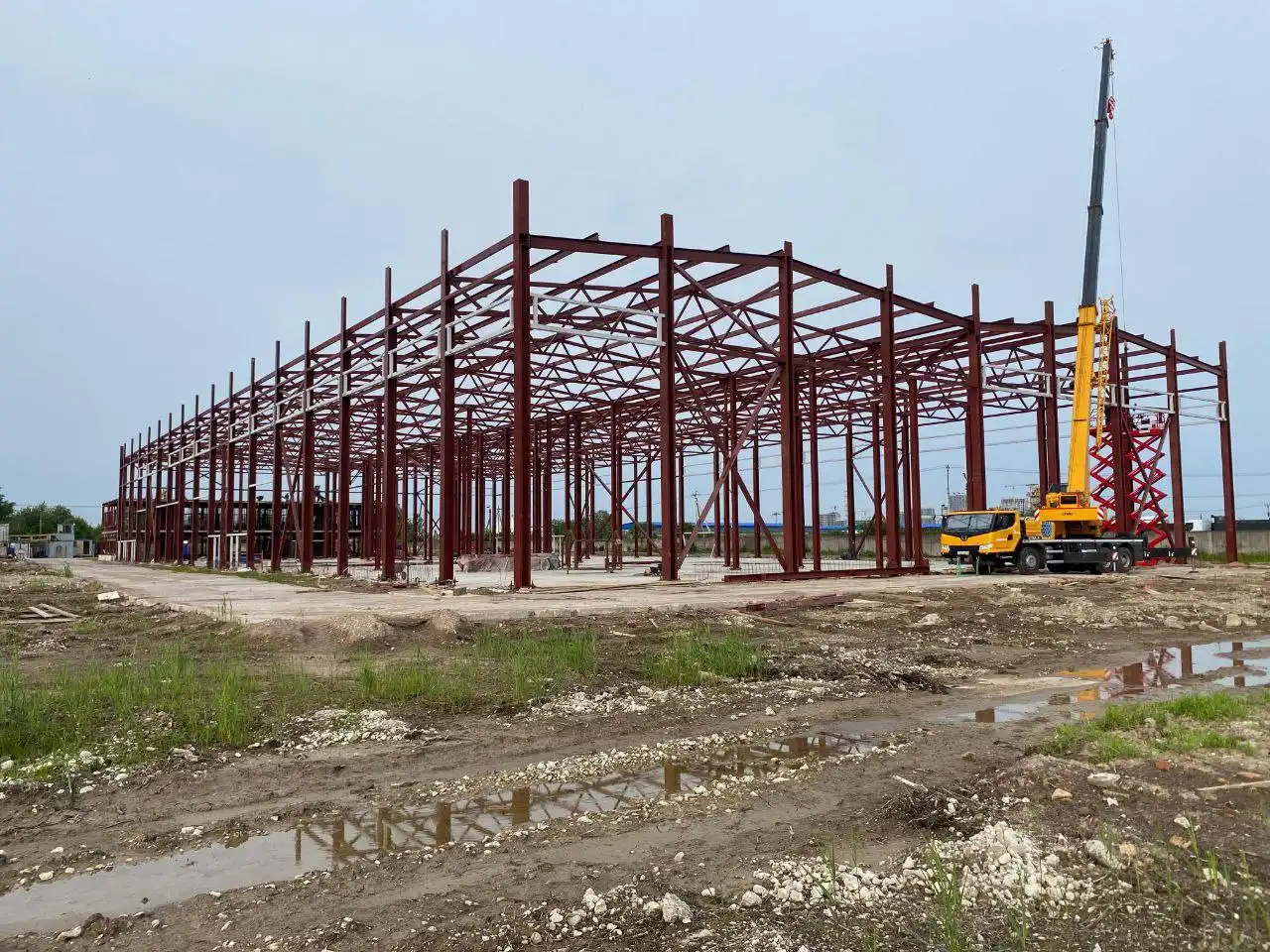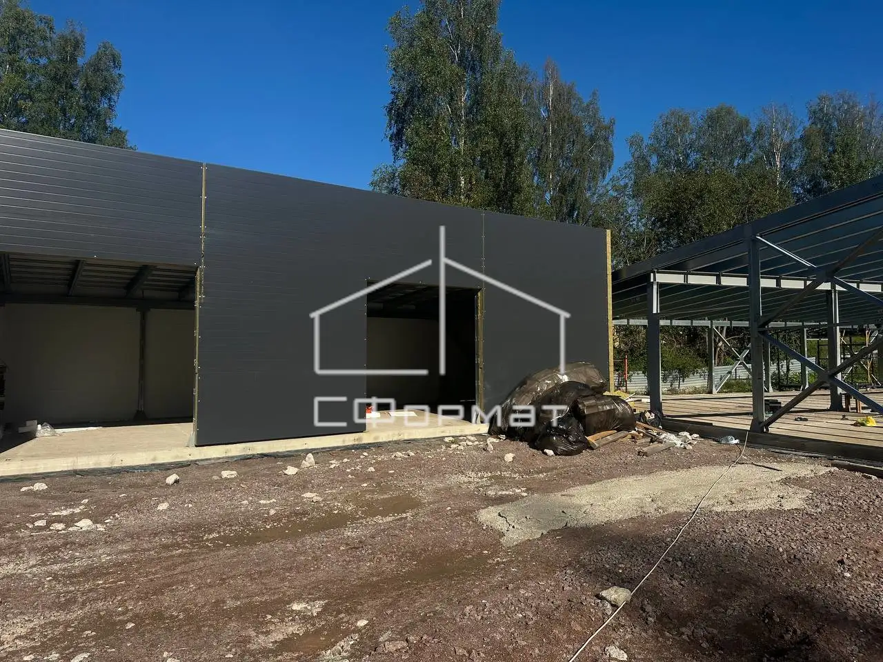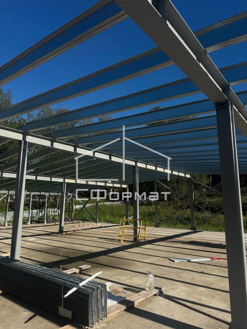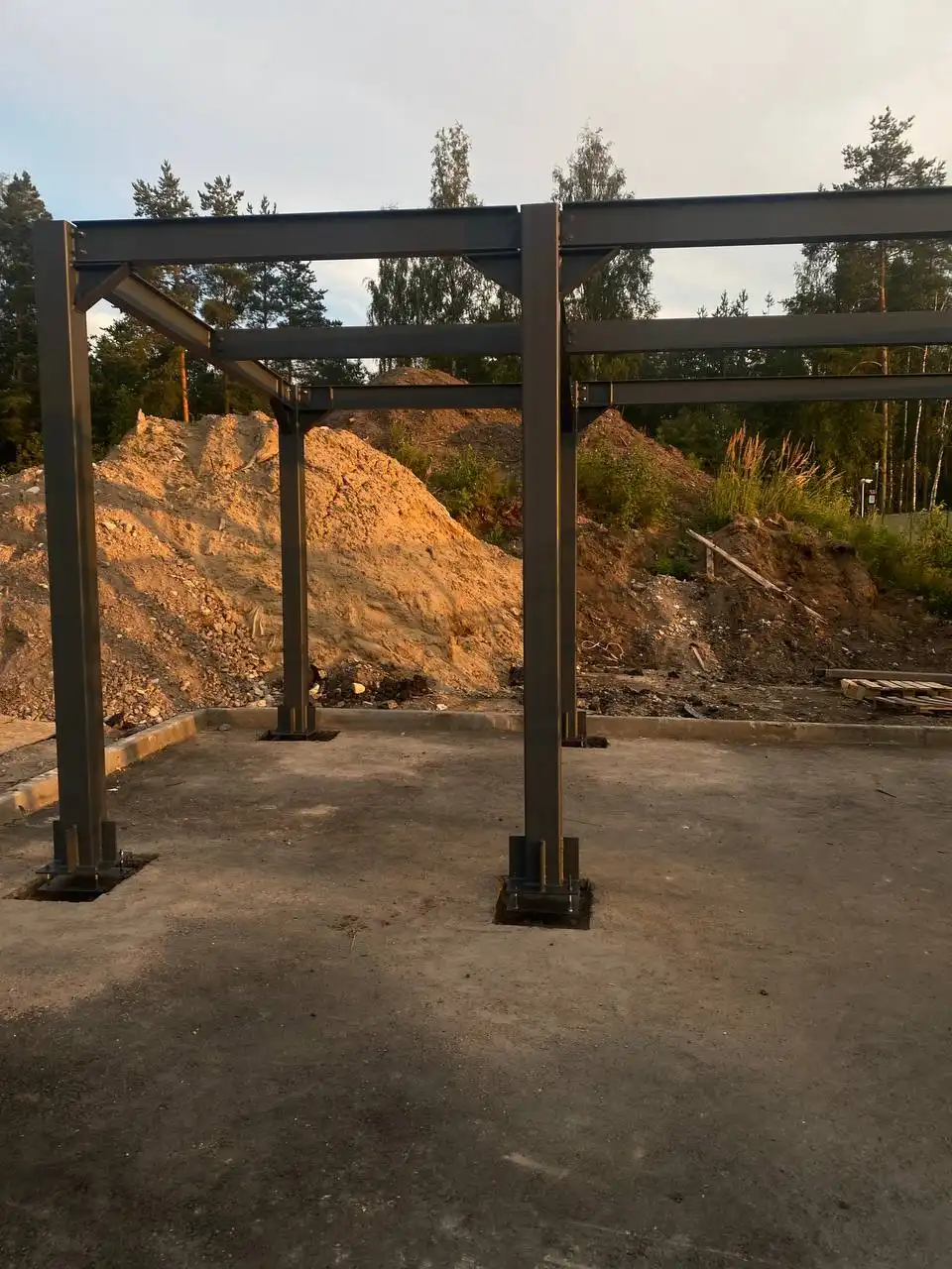 На объекте завершена установка основных несущих колонн и выполнена частичная сборка ферм. Смонтированы стеновые сэндвич-панели, сформированы проёмы под въездные группы и складские проходы. Подготовлена рабочая плита, установлены пороги и анкерные узлы. Параллельно собирается каркас соседнего блока: монтаж ригелей, крепление распорок и установка кровельного профиля.