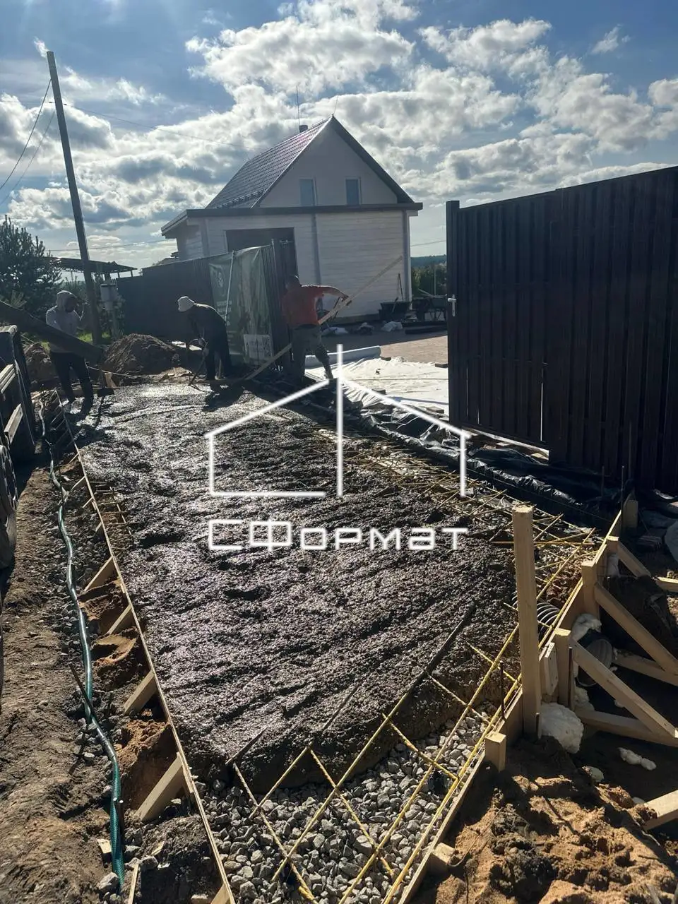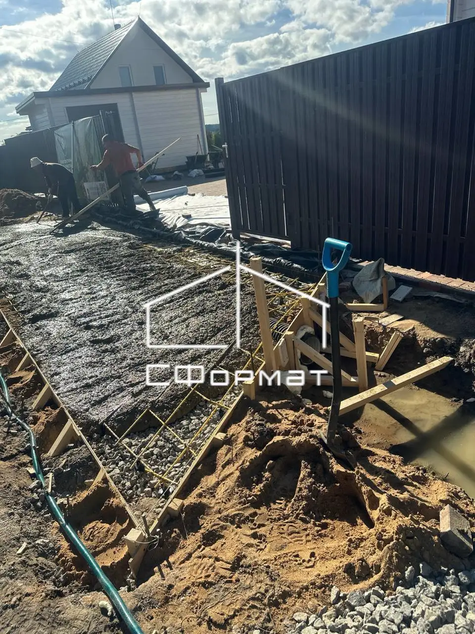 Подготовлены: выровненное основание с подсыпкой щебня, гидроизоляционная плёнка, опалубка по периметру, каркас арматуры с шагом, анкеры и технологические пустоты. Бетон подается и распределяется виброкомпактером для исключения пустот, уровень контролируется правилом и лазерным уровнем. Виден уклон для отвода поверхностных вод и зазор под калитку.